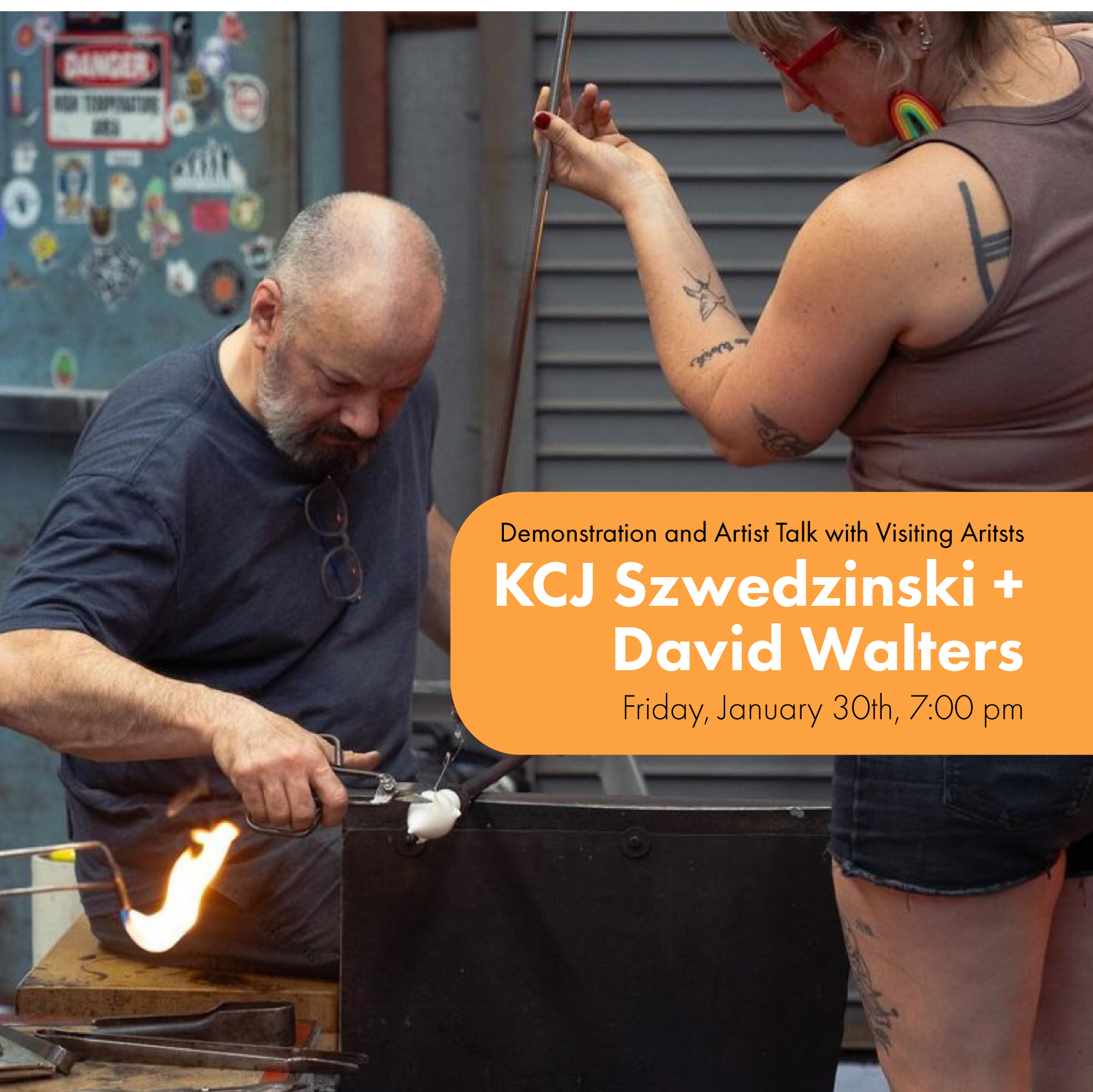 The Bay Area Glass Institute will host a Community Night featuring an Artist Talk and Live Glassblowing & Demonstration for our next Visiting Artist Duo - KCJ Szwedzinski + David Walters, on Friday, January 30th at 7:00 pm.